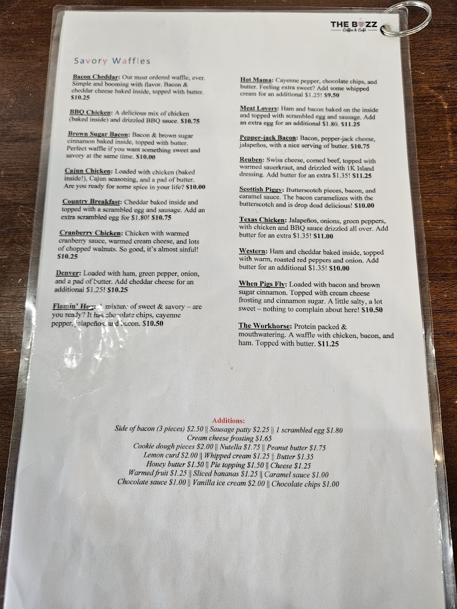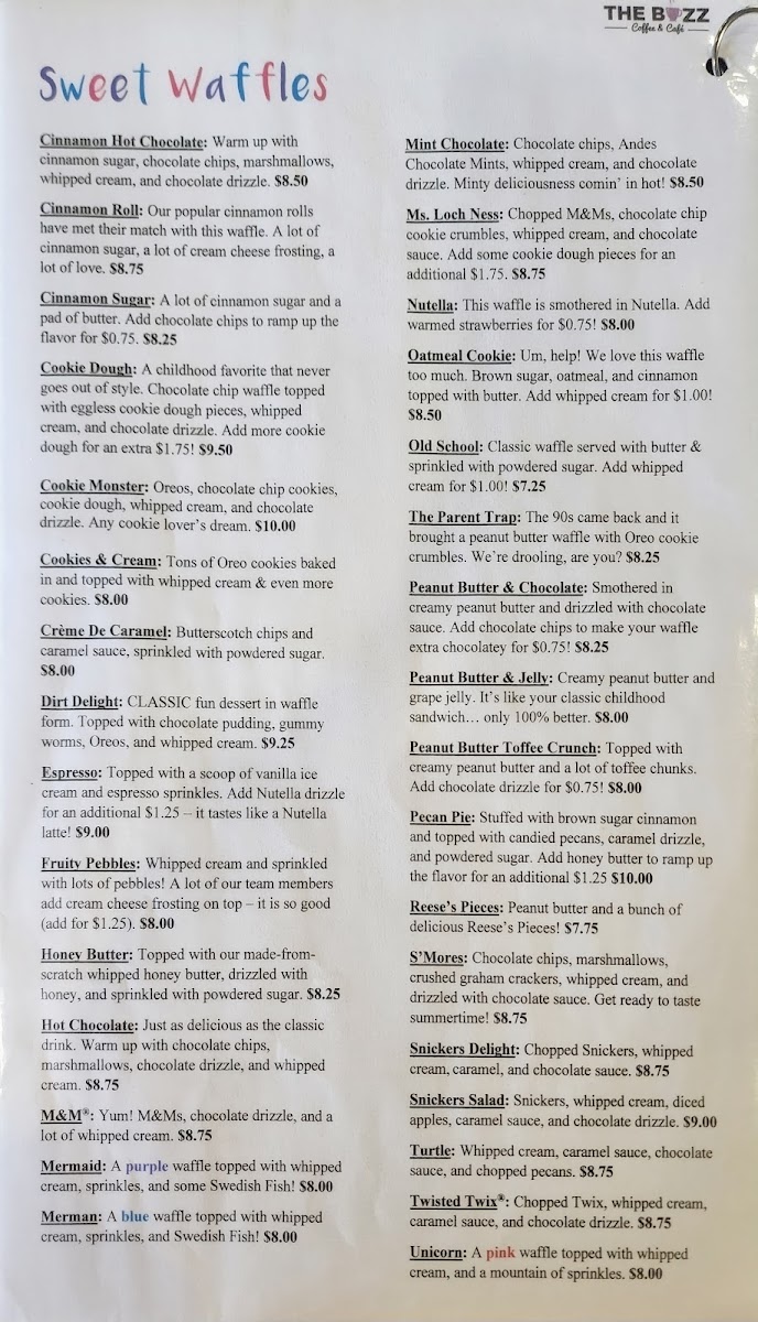 Welcome to The Buzz Coffee & Cafe, located at 411 Burnsville Pkwy, Burnsville, MN. This charming cafe is celebrated for its extensive and exciting menu, particularly its array of delicious waffles. From sweet to savory, options abound, including the popular bacon cheddar waffle and innovative creations like cookie dough and apple crisp waffles.